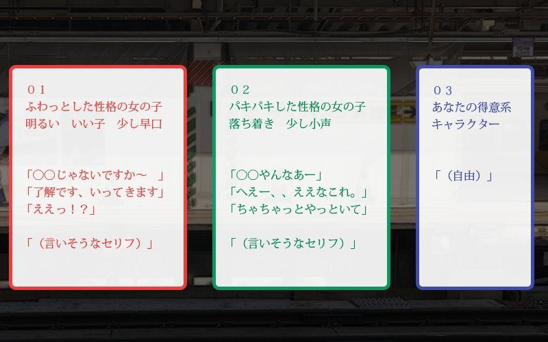 La primera muestra de diálogo es para una chica alegre y animada, mientras que la segunda es de una chica más calmada y tranquila. La tercera muestra no tiene indicaciones y cada aspirante puede decidir qué tipo de personaje representar al grabarla.